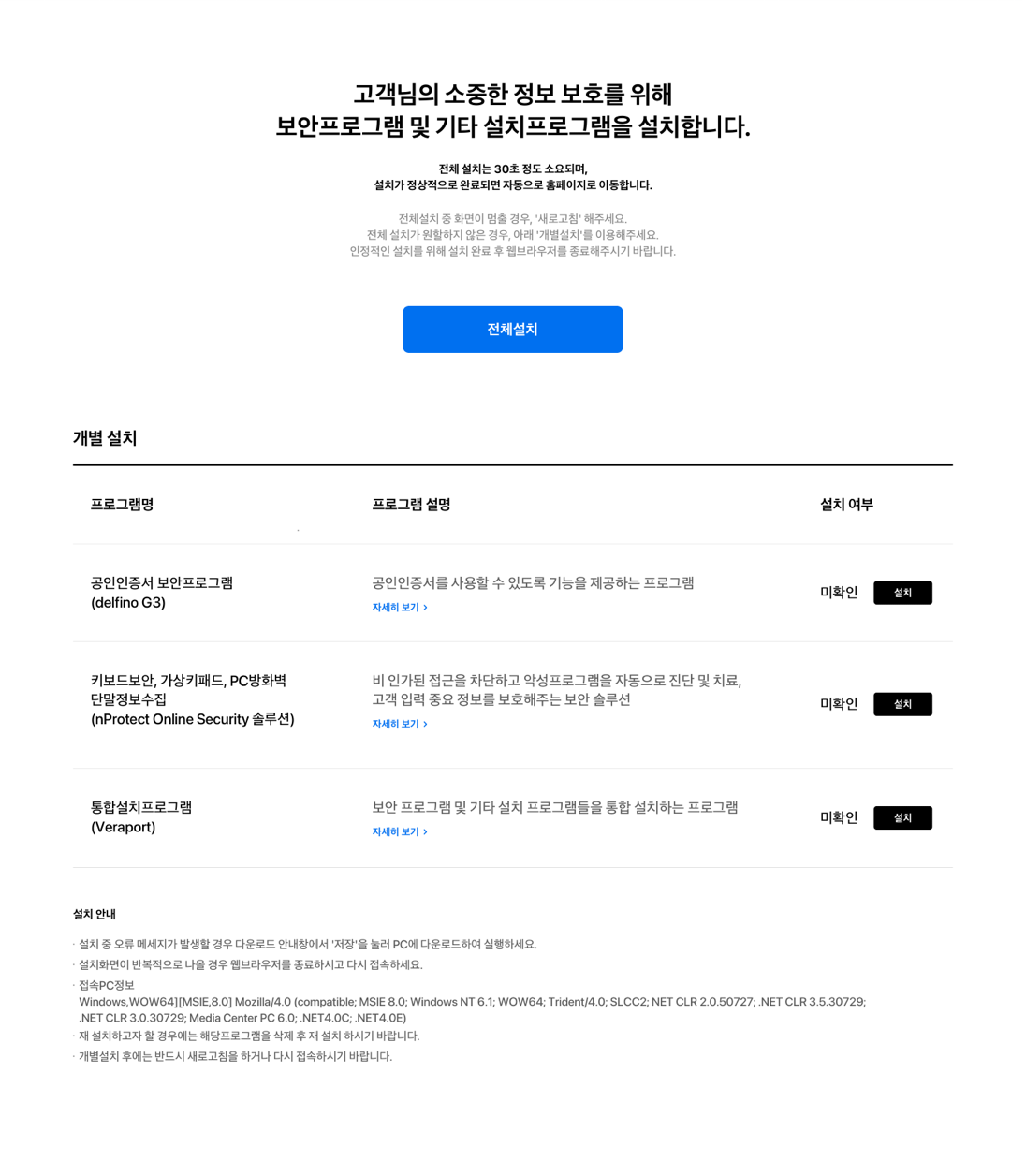 통합설치 대상 프로그램의 설치여부를 VeraPort(통합설치) 프로그램이