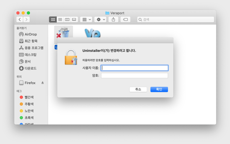 삭제 권한 여부 확인창에서 관리자 권한의 계정/암호를 입력 후 "승인"을 클릭하여 프로그램을 삭제합니다.