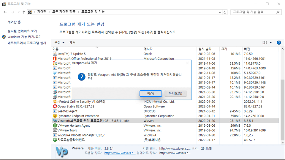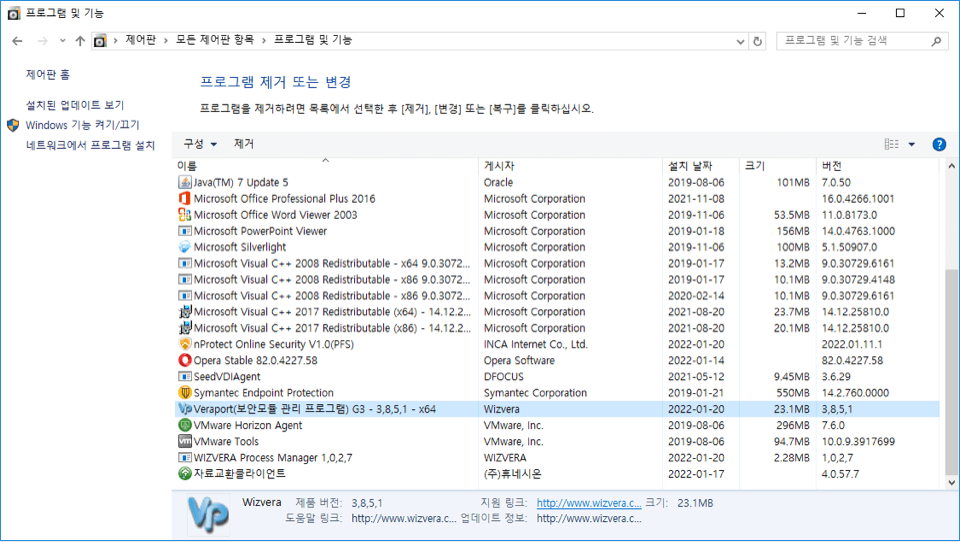 [제어판] > [프로그램 관리] or [프로그램 추가/제거] > Veraport(보안모듈 관리