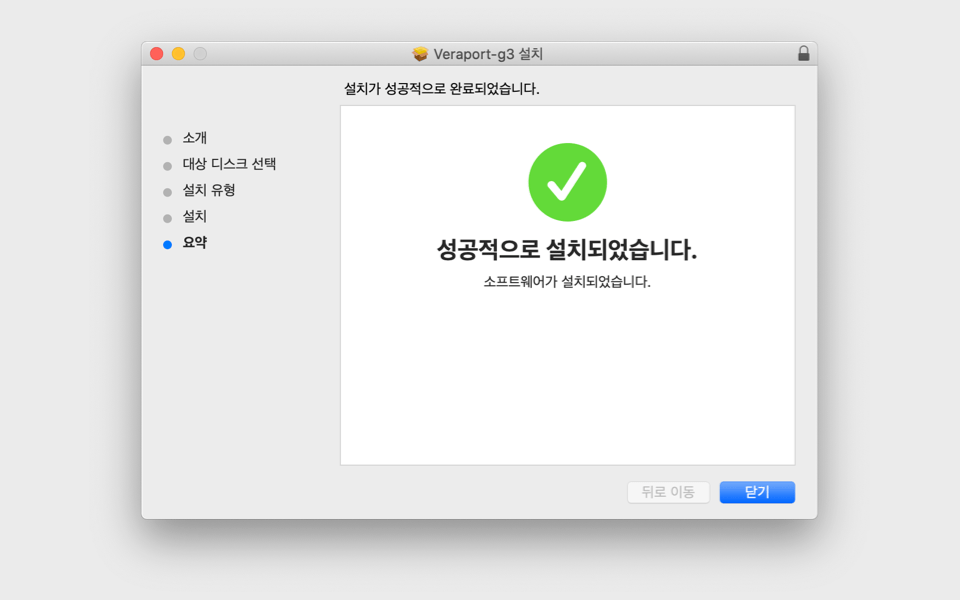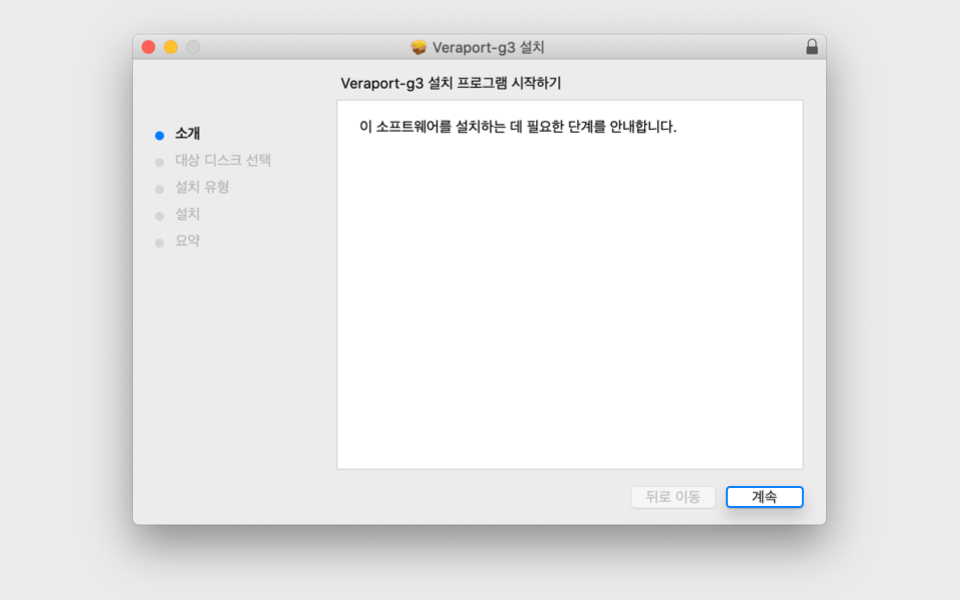 Veraport-g3.pkg를 클릭 후 설치파일을 실행시켜 프로그램을 설치합니다.