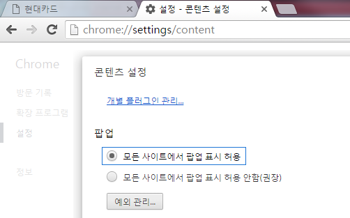 [설정] 버튼을 클릭하여 [팝업창 허가]를 선택합니다.
