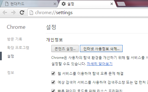 개인정보 설정 중 [인터넷 사용정보 삭제] 버튼을 클릭 합니다.