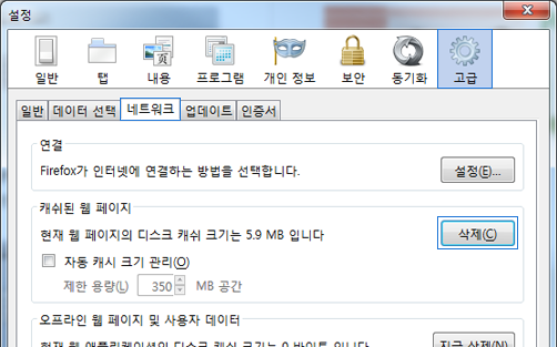 왼쪽 상단 Firefox 탭 메뉴를 선택하신 후 [설정] → [고급] → [네트워크] 에서 [캐쉬된 웹 페이지]