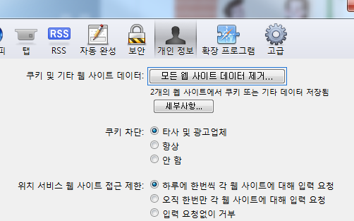 [개인 정보]를 선택하신 후 [모든 웹 사이트 데이터 제거] 버튼을 클릭합니다.
