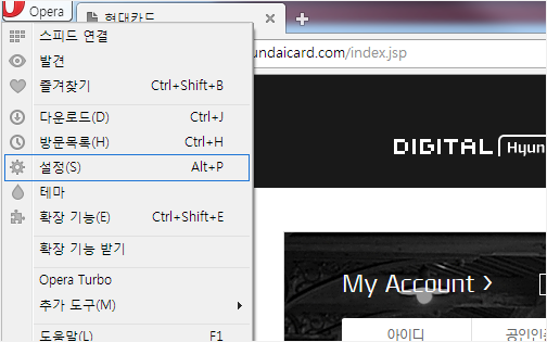 왼쪽 상단의 Opera 탭 메뉴를 선택하신 후 [설정]을 클릭합니다.