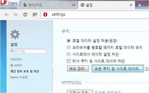 [개인 정보 보호 및 보안] 메뉴를 선택하신 후 [모든 쿠키 및 사이트 데이터] 버튼을 클릭합니다.