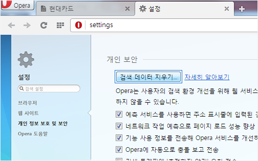 [개인 정보 보호 및 보안] 메뉴를 선택하신 후 [검색 데이터 지우기] 버튼을 클릭합니다.