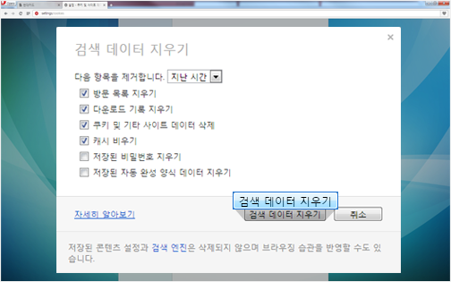 기본 선택항목이 유지된 상태에서 [검색 데이터 지우기] 버튼을 클릭합니다.