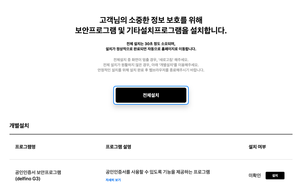 프로그램안내의 "전체설치" 버튼을 클릭하여 저장 위치를 확인하신 후 수동설치 프로그램을 PC에 실행하여
